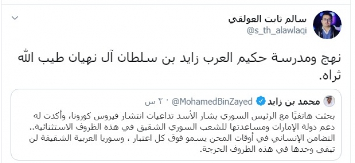 أشاد عضو هيئة رئاسة المجلس الانتقالي الجنوبي، سالم ثابت العولقي، اليوم، بموقف ولي عهد أبو ظبي نائب القائد الأعلى للقوات المسلحة الإماراتية الشيخ محمد بن زايد تجاه سوريا بخصوص أزمة كورونا.