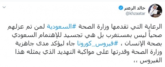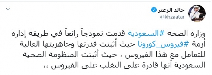 وكتب الزعتر عبر تغريدة له على "تويتر" رصدها " المشهد العربي":"وزارة الصحة السعودية قدمت نموذجاً رائعاً في طريقة إدارة أزمة فيروس كورونا حيث أثبتت قدرتها وجاهزيتها العالية للتعامل مع هذا الفيروس ، حيث أثبتت المنظومة الصحية السعودية أنها قادرة على التغلب على الفيروس".