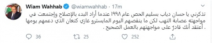 وكتب في تغريدة عبر "تويتر" رصدها "المشهد العربي": "تذكرني يا حسان دياب بسليم الحص عام ١٩٩٨ عندما أراد البدء بالإصلاح واجتمعت في مواجهته عصابة النهب لكن ما ينقصهم اليوم المايسترو غازي كنعان الذي دعمهم يومها . اعتقد أنك قادرٌ على مواجهتهم بالعمل الصحيح".