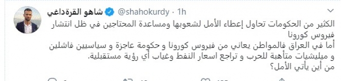 انتقد الكاتب الصحفي العراقي شاهو القرةداغي، اليوم، تعامل حكومة العراق مع أزمة فيروس كورونا.