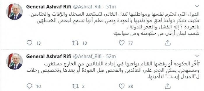 انتقد الوزير اللبناني السابق اللواء أشرف ريفي، اليوم، تأخر رفض الحكومة اللبنانية القيام بواجبها في إعادة اللبنانيين من الخارج.