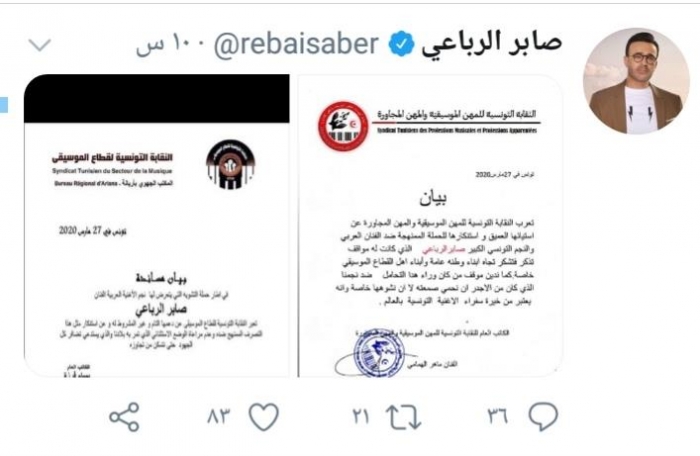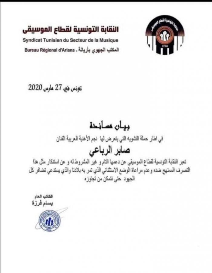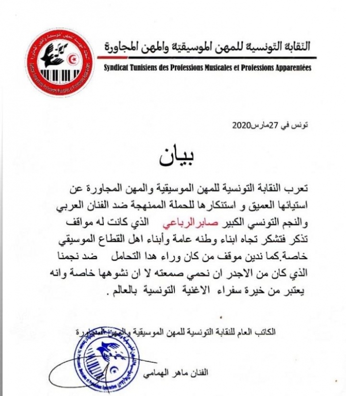 فيما أعلنت النقابة التونسية للمهن الموسيقية والمهن المجاورة، بيانا صحفيا، جاء فيه: "تعرب النقابة عن استياءها العميق واستنكارها للحملة الممنهجة ضد الفنان العربي والنجم التونسي الكبير صابر الرباعي، الذي كانت له مواقف تذكر فتشكر تجاه أبناء وطنه عامة، وأبناء اهل القطاع الموسيقي خاصة، كما ندين موقف من كان وراء هذا التحامل ضد نجمنا الذي كان من الأجدر ان نحمي سمعته لا ان نشوهها خاصة وأنه يعتبر من خيرة سفراء الأغنية التونسية بالعالم".