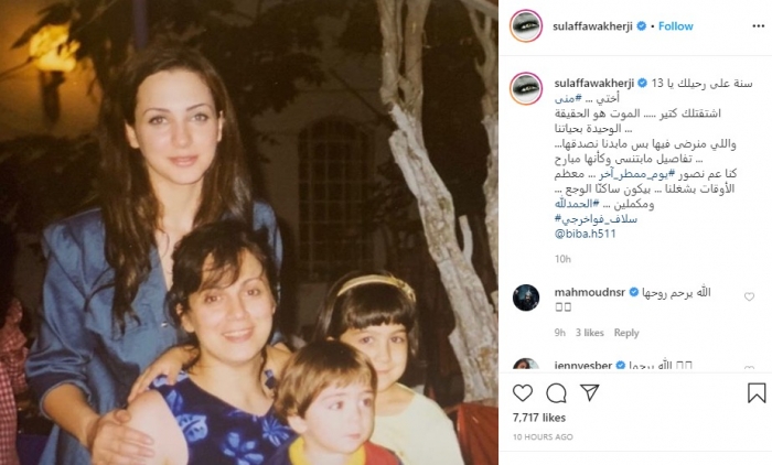 وكتبت سلاف في تعليقها على الصورة "13 سنة على رحيلك يا أختي منى، اشتقتلك كتير، الموت هو الحقيقة الوحيدة بحياتنا، واللي منرضى فيها بس مابدنا نصدقها.. تفاصيل مابتنسى وكأنها مبارح".