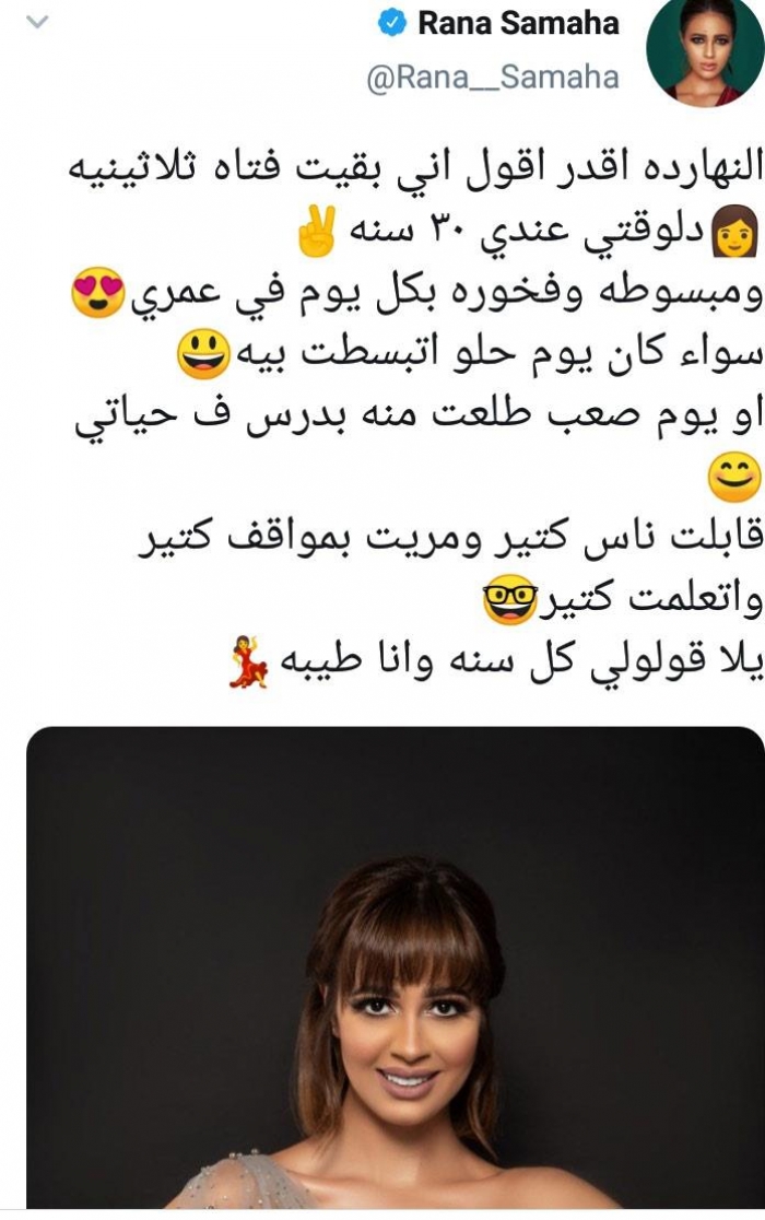 ونشرت رنا، صورة جديدة لها، عبر حسابها على" تويتر"، وعلقت: "النهاردة أقدر أقول إني بقيت فتاة ثلاثينية، دلوقتي عندي ٣٠ سنة، ومبسوطة وفخورة بكل يوم في عمري، سواء كان يوم حلو اتبسطت بيه أو يوم صعب طلعت منه بدرس في حياتي، قابلت ناس كتير، ومريت بمواقف كتير واتعلمت كتير".