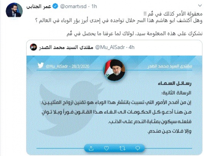وقال الصدر في تغريدة عبر "تويتر، إن "من أفدح الأمور التي تسببت بانتشار هذا الوباء هو تقنين (زواج المثليين)".