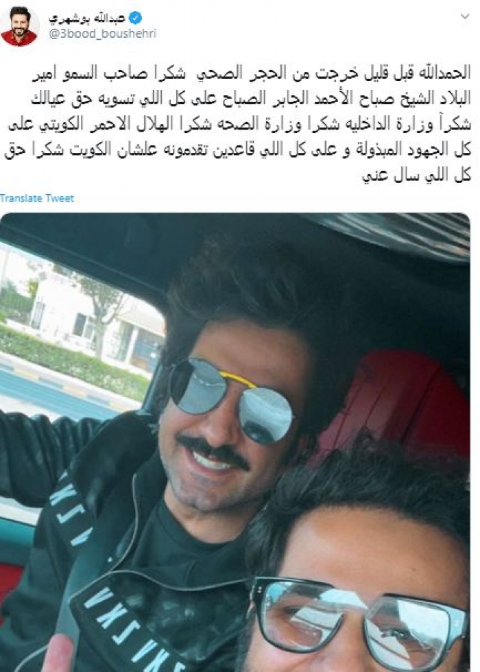 غادر الفنان الكويتي عبدالله بوشهري الحجر الصحي بعد أكثر من شهر من تواجده فيه عقب عودته من السفر للتـأكد من عدم إصابته بفيروس كورونا المستجد، حيث نشر صورة له مع شقيقه، عبر حسابه بموقع "تويتر"، معلقا عليها قائلا :" الحمد الله قبل قليل خرجت من الحجر الصحي، شكراً أمير البلاد ووزارة الداخلية، وزارة الصحة، والهلال الأحمرالكويتي على كل الجهود المبذولة وعلى كل شيء تقدمونه لأجل الكويت، شكراً حق كل الذي سأل عني وتمنى لي السلامة أحبكم وايد وايد".