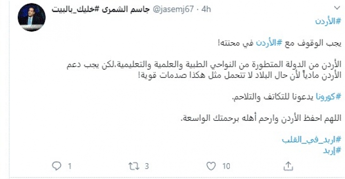 وقال في تغريدة عبر "تويتر" رصدها "المشهد العربي": "يجب الوقوف مع الأردن في محنته! الأردن من الدولة المتطورة من النواحي الطبية والعلمية والتعليمية،لكن يجب دعم الأردن مادياً لأن حال البلاد لا تتحمل مثل هكذا صدمات قوية!