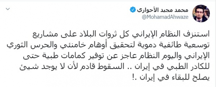 توقع الكاتب الصحفي محمد مجيد الأحوازي، اليوم الأحد، سقوط النظام الإيراني قريبا، مؤكدا أنه أنفق كل ثروات البلد على مشروعاته الطائفية.
