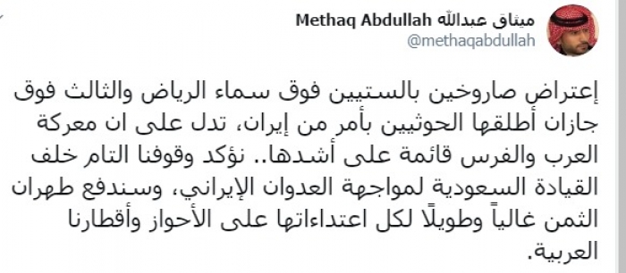 وكتب عبد الله عبر تغريدة له على "تويتر" رصدها " المشهد العربي":"اعتراض صاروخين بالستيين فوق سماء الرياض والثالث فوق جازان أطلقها الحوثيين بأمر من إيران، تدل على أن معركة العرب والفرس قائمة على أشدها".