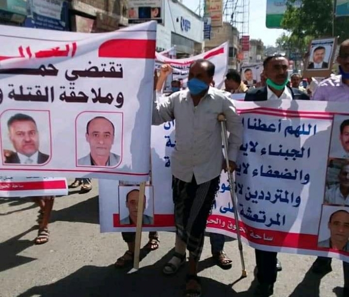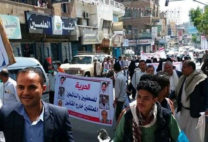 وطالب المحتجون بإطلاق سراح الصحافيين جميل الصامت، وجميل الشجاع، والناشط عبدالله فرحان، المختطفين في السجون السرية للمليشيا.