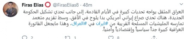 وقال في تغريدة عبر "تويتر" رصدها "المشهد العربي": "العراق المثقل يواجه تحديات كبيرة في الأيام القادمة، إلى جانب تحدي تشكيل الحكومة الجديدة، هناك تحدي صراع إيراني أمريكي بدا يلوح في الأفق، وسط تقزيم متعمد تمارسه المليشيات المسلحة القريبة من إيران في العراق، وهذا ما يجعل الفاتورة العراقية كبيرة جداً سياسياً واقتصادياً وأمنياً".