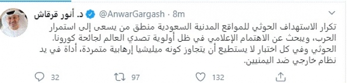 وكتب في تغريدة عبر "تويتر" رصدها "المشهد العربي": "تكرار الاستهداف الحوثي للمواقع المدنية السعودية منطق من يسعى إلى استمرار الحرب، ويبحث عن الاهتمام الإعلامي في ظل أولوية تصدي العالم لجائحة كورونا".