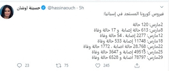 وقالت في تغريدة عبر "تويتر" رصدها "المشهد العربي": "فيروس كورونا المستجد في إسبانيا 2مارس: 120 حالة.. 8 مارس: 613 حالة إصابة و 17 حالة وفاة.. 12مارس: 2277 إصابة ، 54 حالة وفاة".