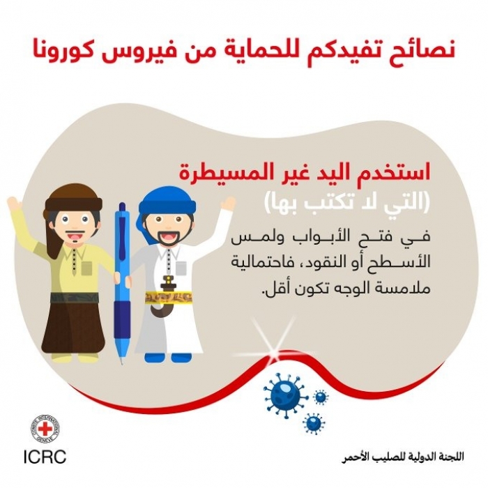 نصحت اللجنة الدولية للصليب الأحمر، المواطنين اليمنيين باستخدام اليد غير المسيطرة التي لا يُكتب بها في فتح الأبواب ولمس الأسطح أو النقود.