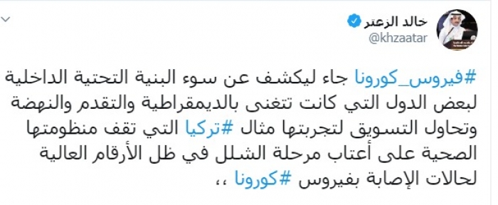 وكتب الزعتر عبر تغريدة له على " تويتر" رصدها " المشهد العربي":" فيروس كورونا جاء ليكشف عن سوء البنية التحتية الداخلية لبعض الدول التي كانت تتغنى بالديمقراطية والتقدم والنهضة وتحاول التسويق لتجربتها مثال تركيا التي تقف منظومتها الصحية على أعتاب مرحلة الشلل في ظل الأرقام العالية لحالات الإصابة بفيروس كورنا".