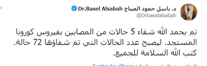 وكتب الصباح عبر تغريدة له على "تويتر" رصدها " المشهد العربي":" تم بحمد الله شفاء 5 حالات من المصابين بفيروس كورونا المستجد، ليصبح عدد الحالات التي تم شفاؤها 72 حالة، كتب الله السلامة للجميع".