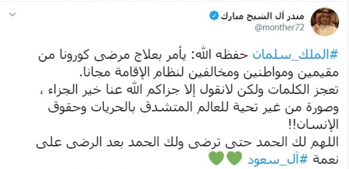 وكتب مبارك عبر تغريدة له على "تويتر" رصدها " المشهد العربي":"الملك سلمان حفظه الله،يأمر بعلاج مرضى كورونا من مقيمين ومواطنين ومخالفين لنظام الإقامة مجانا".