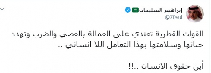 وكتب السليمان عبر تغريدة له على "تويتر" رصدها " المشهد العربي":"القوات القطرية تعتدي على العمالة بالعصي والضرب وتهدد حياتها وسلامتها بهذا التعامل اللا إنساني".