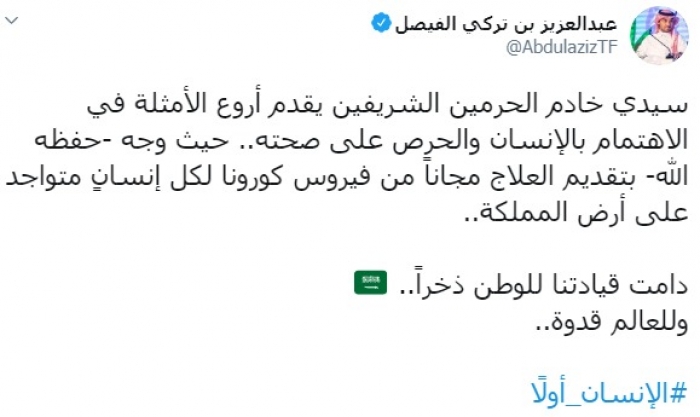 وكتب الفيصل عبر تغريدة له على " تويتر" رصدها " المشهد العربي":"سيدي خادم الحرمين الشريفين يقدم أروع الأمثلة في الاهتمام بالإنسان والحرص على صحته،حيث وجه بتقديم العلاج مجاناً من فيروس كورونا لكل إنسانٍ متواجد على أرض المملكة".