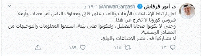 وقال في تغريدة عبر "تويتر" رصدها "المشهد العربي": "لعل ارتباط الإشاعات بالأزمات واللعب على قلق ومخاوف الناس أمر معتاد، وأزمة فيروس كورونا لا تخرج عن هذا".