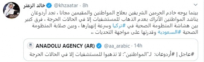 وقال في تغريدة عبر "تويتر" رصدها "المشهد العربي": "بينما يوجه خادم الحرمين الشريفين بعلاج المواطنين والمقيمين مجاناً، نجد أردوغان يناشد المواطنين الأتراك بعدم الذهاب للمستشفيات إلا في الحالات الحرجة".