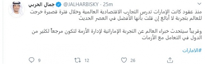 وكتب في تغريدة عبر "تويتر" رصدها "المشهد العربي": "منذ عقود كانت الإمارات تدرس التجارب الاقتصادية العالمية وخلال فترة قصيرة خرجت للعالم بتجربة لا أبالغ إن قلت بأنها الأفضل في العصر الحديث.. وقريباً سيتحدث خبراء العالم عن التجربة الإماراتية لإدارة الأزمة لتكون مرجعاً لكثير من الدول في التعامل مع الأزمات".