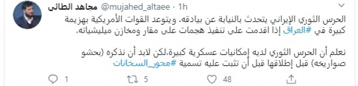 وقال في تغريدة عبر "تويتر" رصدها "المشهد العربي": "الحرس الثوري الإيراني يتحدث بالنيابة عن بيادقه، ويتوعد القوات الأمريكية بهزيمة كبيرة في العراق إذا اقدمت على تنفيذ هجمات على مقار ومخازن مليشياته".