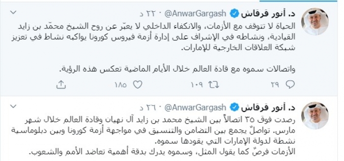 وتابع:"الحياة لا تتوقف مع الأزمات، والانكفاء الداخلي لا يعبّر عن روح الشيخ محمّد بن زايد القيادية، ونشاطه في الإشراف على إدارة أزمة فيروس كورونا يواكبه نشاط في تعزيز شبكة العلاقات الخارجية للإمارات".