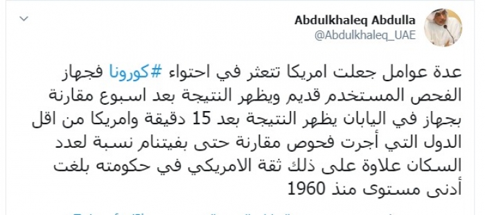 وكتب عبد الله عبر تغريدة له على "تويتر" رصدها " المشهد العربي":"عدة عوامل جعلت أمريكا تتعثر في احتواء كورونا فجهاز الفحص المستخدم قديم ويظهر النتيجة بعد أسبوع مقارنة بجهاز في اليابان يظهر النتيجة بعد 15 دقيقة".