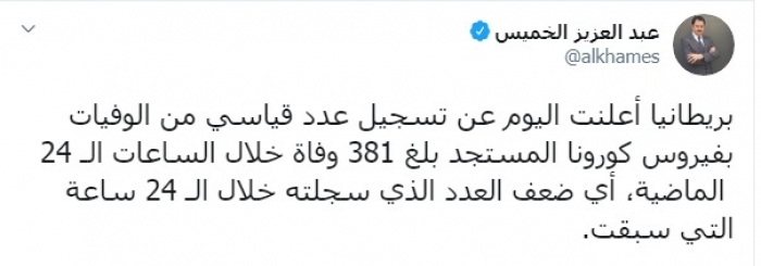 وكتب الخميس عبر تغريدة له على "تويتر" رصدها " المشهد العربي":" بريطانيا أعلنت اليوم عن تسجيل عدد قياسي من الوفيات بفيروس كورونا المستجد بلغ 381 وفاة خلال الساعات الـ 24 الماضية".