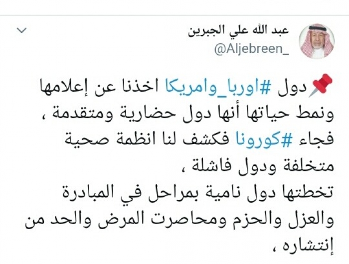 وكتب الجبرين عبر تغريدة له على "تويتر" رصدها "المشهد العربي":"دول أوروبا وأمريكا أخذنا عن إعلامها ونمط حياتها أنها دول حضارية ومتقدمة ، فجاء كورونا فكشف لنا أنظمة صحية متخلفة ودول فاشلة".