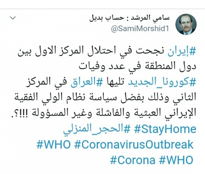 وكتب المرشد عبر تغريدة له على "تويتر" رصدها " المشهد العربي":" إيران نجحت في احتلال المركز الأول بين دول المنطقة في عدد وفيات كورونا الجديد، تليها العراق في المركز الثاني وذلك بفضل سياسة نظام الولي الفقية الإيراني العبثية والفاشلة وغير المسؤولة".