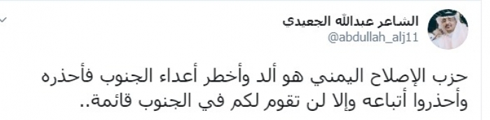 وكتب الجعيدي عبر تغريدة له على "تويتر" رصدها " المشهد العربي":"حزب الإصلاح اليمني هو ألد وأخطر أعداء الجنوب فأحذره واحذروا أتباعه وإلا لن تقوم لكم في الجنوب قائمة".
