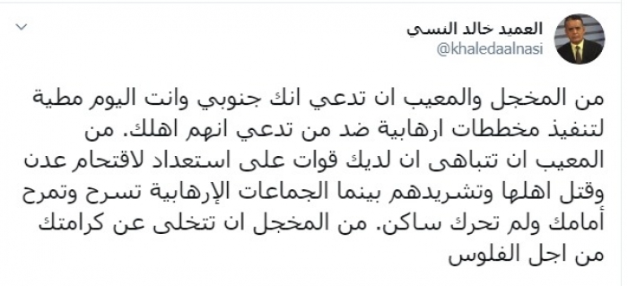 وكتب النسي عبر تغريدة له على "تويتر" رصدها " المشهد العربي":" من المخجل والمعيب أن تدعي أنك جنوبي، وأنت اليوم مطية لتنفيذ مخططات إرهابية ضد من تدعي أنهم أهلك".