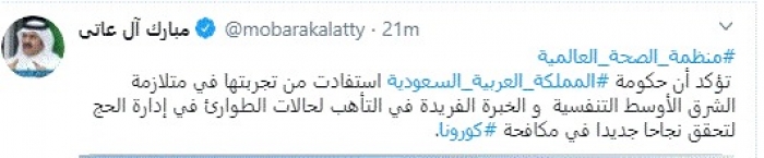 وقال في تغريدة عبر "تويتر" رصدها "المشهد العربي": "منظمة الصحة العالمية تؤكد أن حكومة المملكة العربية السعودية استفادت من تجربتها في متلازمة الشرق الأوسط التنفسية والخبرة الفريدة في التأهب لحالات الطوارئ في إدارة الحج لتحقق نجاحا جديدا في مكافحة كورونا".