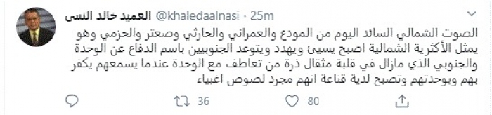 وقال في تغريدة عبر "تويتر" رصدها "المشهد العربي": "الصوت الشمالي السائد اليوم من المودع والعمراني والحارثي وصعتر والحزمي وهو يمثل الأكثرية الشمالية أصبح يسيئ ويهدد ويتوعد الجنوبيين باسم الدفاع عن الوحدة".