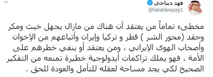 وكتب ديباجي عبر تغريدة له على "تويتر" رصدها "المشهد العربي"مخطىء تماماً من يعتقد أن هناك من مازال يجهل خبث ومكر وحقد (محور الشر ) قطر و تركيا وإيران وأتباعهم من الإخوان وأصحاب الهوى الإيراني".