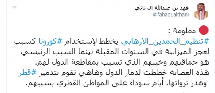 وكتب آل ثاني عبر تغريدة له على "تويتر" رصدها " المشهد العربي":"تنظيم الحمدين الإرهابي يخطط لاستخدام كورونا كسبب لعجز الميزانية في السنوات المقبلة بينما السبب الرئيسي هو حماقتهم وخبثهم الذي تسبب بمقاطعة الدول لهم".