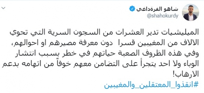 طالب الكاتب الصحفي العراقي شاهو القرة داغي، اليوم الأربعاء، بإنقاذ حياة المعتقلين في سجون المليشيات العراقية.