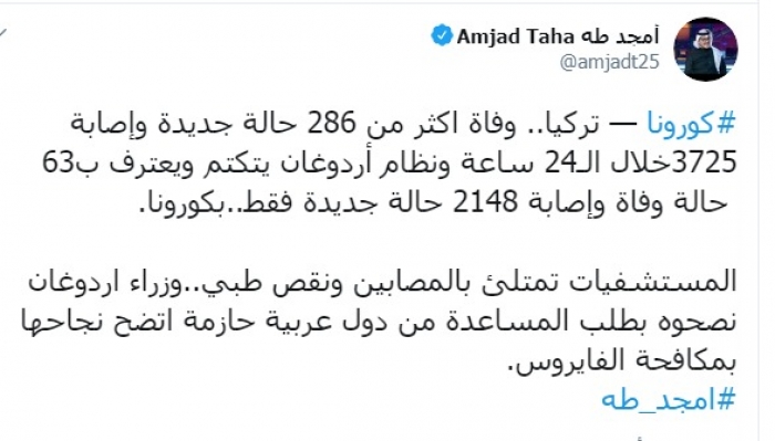 وكتب طه عبر تغريدة له على "تويتر" رصدها " المشهد العربي":" وفاة أكثر من 286 حالة جديدة، وإصابة 3725خلال الـ24 ساعة، ونظام أردوغان يتكتم ويعترف بـ63 حالة وفاة وإصابة 2148 حالة جديدة فقط بكورونا".