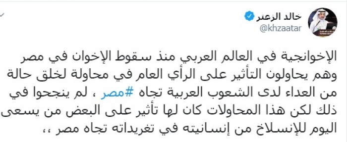 وكتب الزعتر عبر تغريدة له على "تويتر" رصدها " المشهد العربي":" الإخوانجية في العالم العربي منذ سقوط الإخوان في مصر وهم يحاولون التأثير على الرأي العام في محاولة لخلق حالة من العداء لدى الشعوب العربية تجاه مصر ، لم ينجحوا في ذلك".