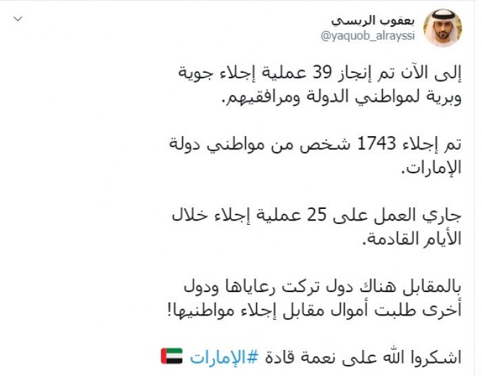 وكتب الريسي عبر تغريدة له على "تويتر" رصدها " المشهد العربي":"إلى الآن تم إنجاز 39 عملية إجلاء جوية وبرية لمواطني الدولة ومرافقيهم، وتم إجلاء 1743 شخص من مواطني دولة الإمارات.