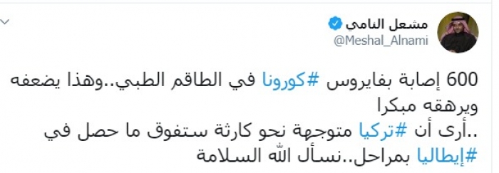 وأضاف:" 600 إصابة بفيروس كورونا في الطاقم الطبي، وهذا يضعفه ويرهقه مبكرا، أرى أن تركيا متوجهة نحو كارثة ستفوق ما حصل في إيطاليا بمراحل،نسأل الله السلامة".