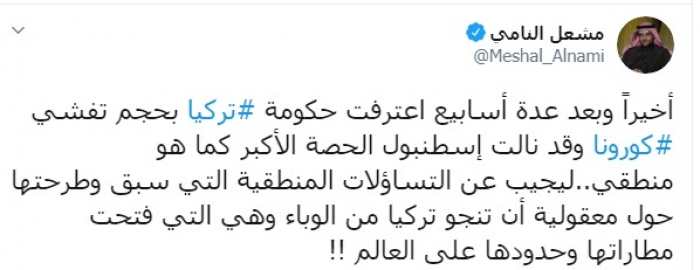 وكتب النامي عبر تغريدات له على "تويتر" رصدها " المشهد العربي":"أخيراً وبعد عدة أسابيع اعترفت حكومة تركيا بحجم تفشي كورونا وقد نالت إسطنبول الحصة الأكبر كما هو منطقي،ليجيب عن التساؤلات المنطقية التي سبق وطرحتها حول معقولية أن تنجو تركيا من الوباء وهي التي فتحت مطاراتها وحدودها على العالم".