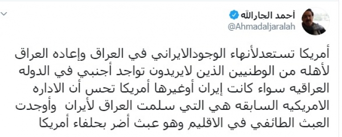 وكتب الجارلله عبر تغريدة له على "تويتر" رصدها " المشهد العربي":" أمريكا تستعد لإنهاء الوجود الإيراني في العراق وإعادة العراق لأهله من الوطنيين الذين لا يريدون تواجد أجنبي في الدولة العراقية سواء كانت إيران أو غيرها".