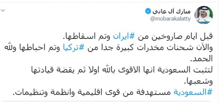 وكتب آل عاتي عبر تغريدة له على "تويتر" رصدها " المشهد العربي":"قبل أيام صاروخين من إيران وتم إسقاطها، والآن شحنات مخدرات كبيرة جدا من تركيا وتم إحباطها ولله الحمد".