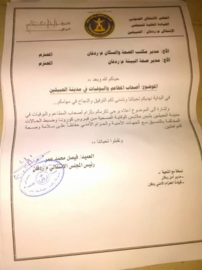 انتقالي ردفان: فرق للتفتيش على مطاعم الحبيلين (وثيقة)