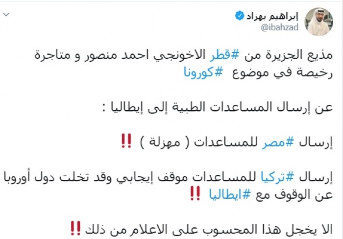 وأضاف بهزاد :"عن إرسال المساعدات الطبية إلى إيطاليا كتب منصور : إرسال مصر للمساعدات ( مهزلة)، وإرسال تركيا للمساعدات موقف إيجابي وقد تخلت دول أوروبا عن الوقوف مع ايطاليا".