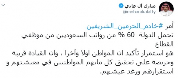 وكتب آل عاتي عبر تغريدة له على "تويتر" رصدها" المشهد العربي":" أمر خادم الحرمين الشريفين تحمل الدولة 60 % من رواتب السعوديين من موظفي القطاع الخاص هو استمرار تأكيد أن المواطن أولا وأخرا".