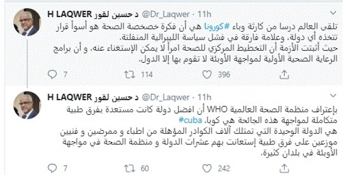 وكتب في تغريدات عبر "تويتر" رصدها "المشهد العربي": "تلقى العالم درسًا من كارثة وباء كورونا هي أن فكرة خصخصة الصحة هو أسوأ قرار تتخذه أي دولة، وعلامة فارقة في فشل سياسة الليبرالية المنفلتة. حيث أثبتت الأزمة أن التخطيط المركزي للصحة أمرًا لا يمكن الاستغناء عنه، وأن برامج الرعاية الصحية الأولية لمواجهة الأوبئة لا تقوم بها إلا الدول".